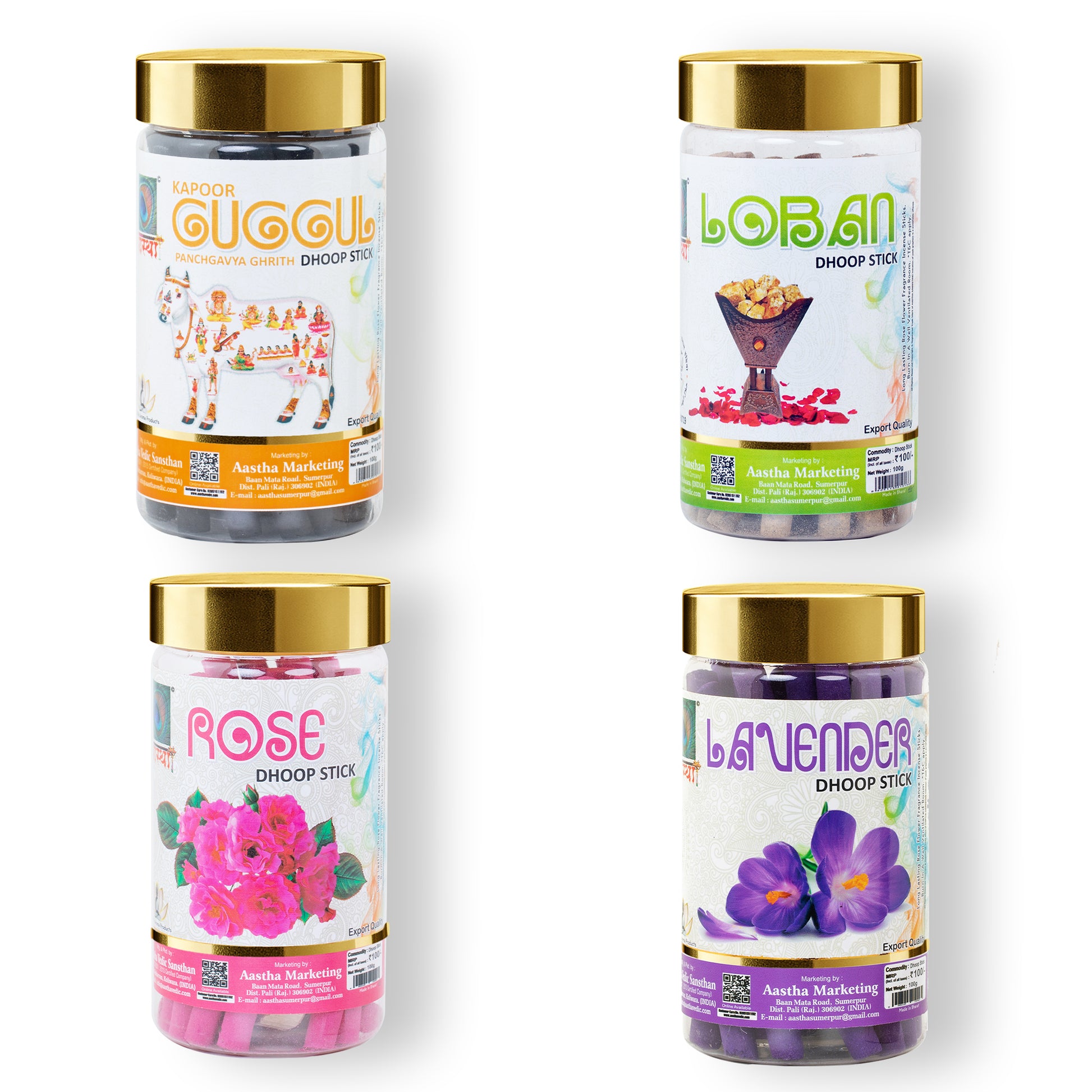 - AASTHA DHOOP STICKS COMBO PACK 4 IN 1 (GUGGLE, LOBAN, ROSE & LAVENDER)
