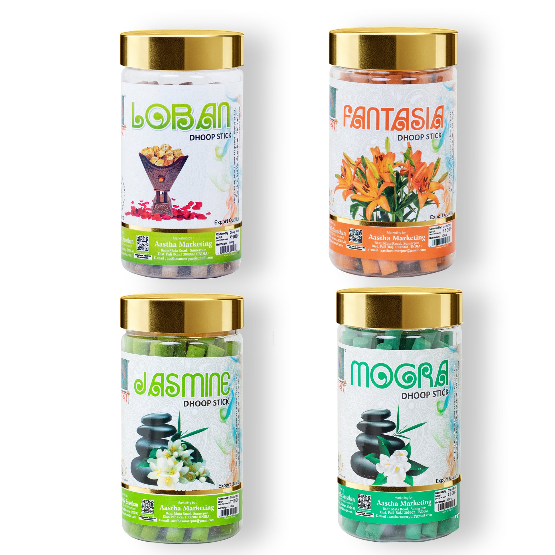 - AASTHA DHOOP STICKS COMBO PACK 4 IN 1 (LOBAN, FATASIA, JASMINE & MOGRA)