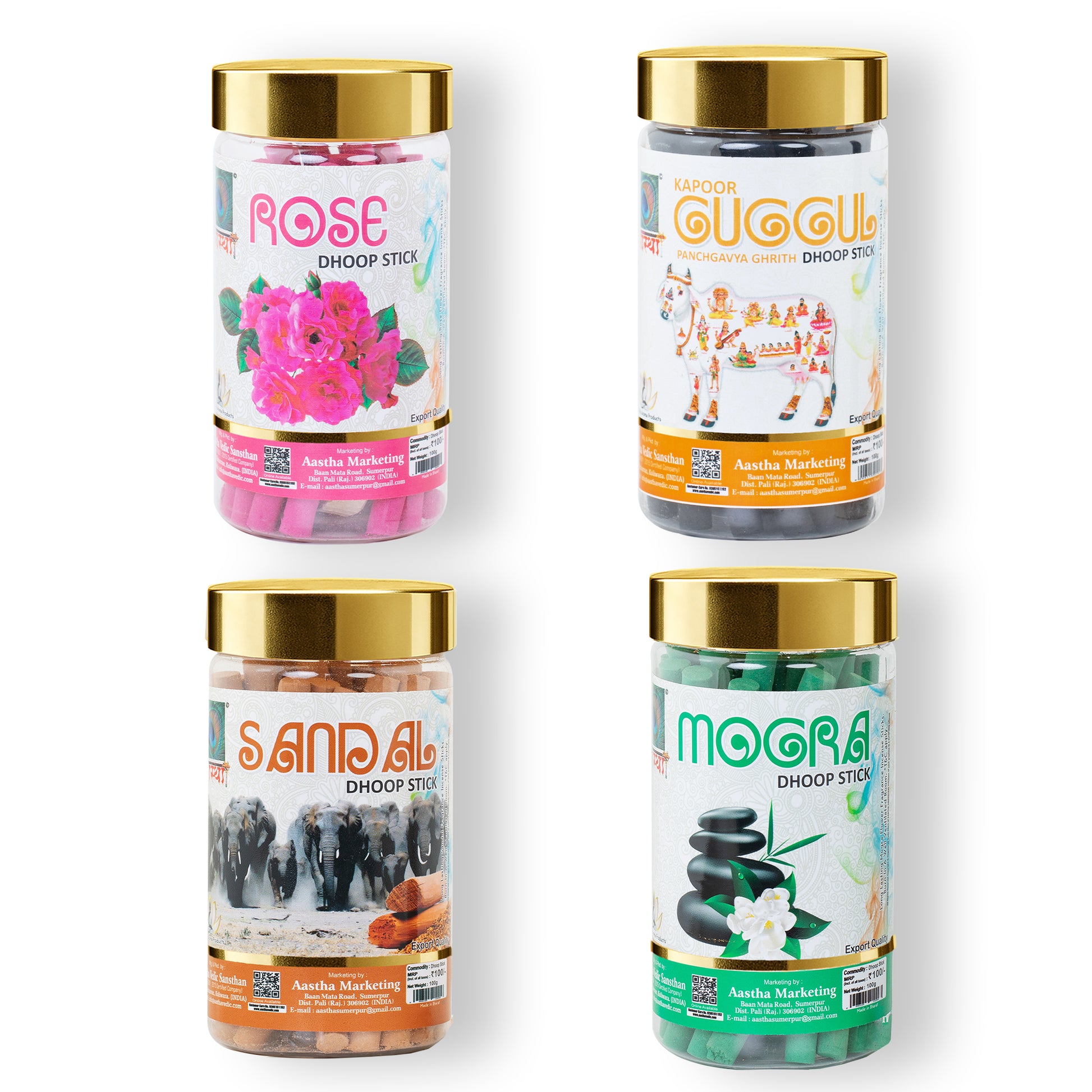 - AASTHA DHOOP STICKS COMBO PACK 4 IN 1 (ROSE, GUGGUL, SANDAL, MOGRA )